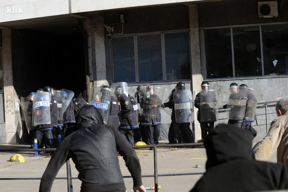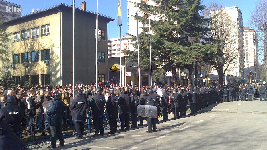 16:07 – U Tuzli demonstranti otišli pred zgradu Kantonalnog suda, gdje ih je dočekalo jako policijsko obezbjeđenje. Uslijedilo je kamenovanje zgrade.