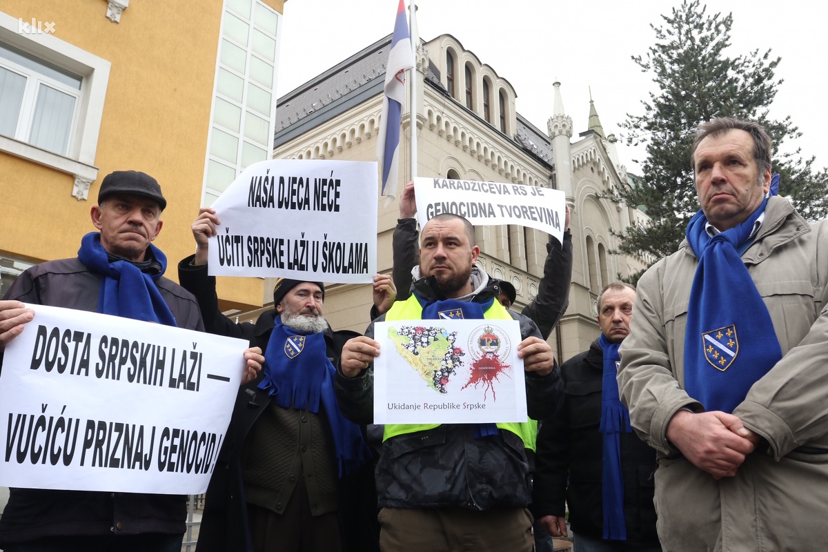 Okupljeni su plakatima pozivali predsjednika Srbije Aleksandra Vučića da prizna genocid u Srebrenici, uz poruke da je Vučić učestvovao u agresiji na našu državu. Okupljanje je predvodio čelnik pokreta Sejfudin Tokić.