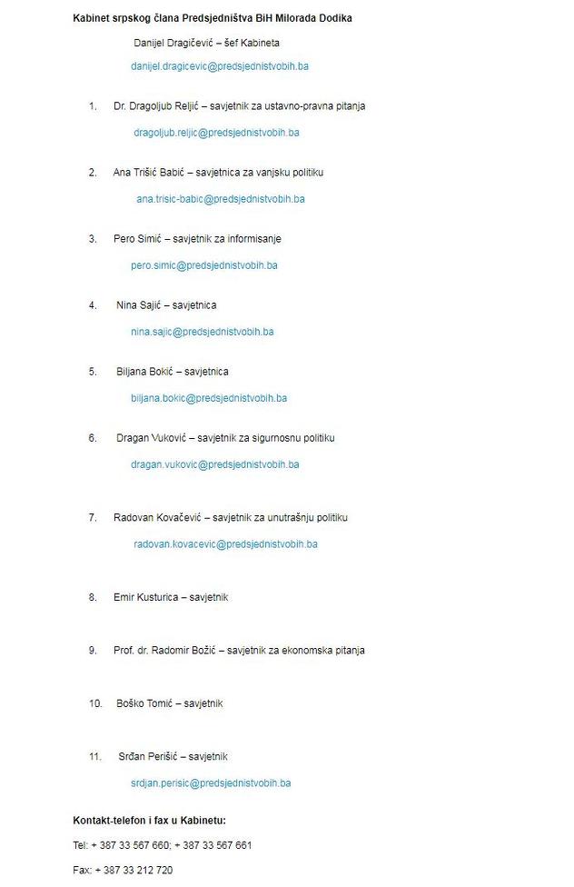 Kao savjetnici, a za koje nije navedena oblast iz koje savjetuju Dodika, navedeni su Emir Kusturica, Nina Sajić, Biljana Bokić, Boško Tomić i Srđan Perišić.