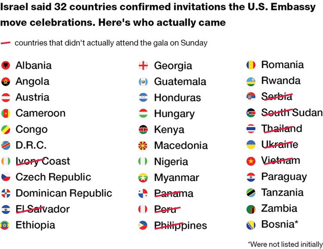 Prijemu u nedjelju prisustvovali su predstavnici Austrije, Mađarske, Rumunije i Češke, uprkos stavu Evropske unije protiv preseljenja američke ambasade, uz predstavnike Gvatemale, Paragvaja, Hondurasa, Bosne i Hercegovine, Gruzije, Makedonije, Mjanmara, Angole, Kameruna, Demokratske Republike Konga, Republike Konga, Dominikanske Republike, Etiopije, Kenije, Nigerije, Ruande, Zambije i Tanzanije.
