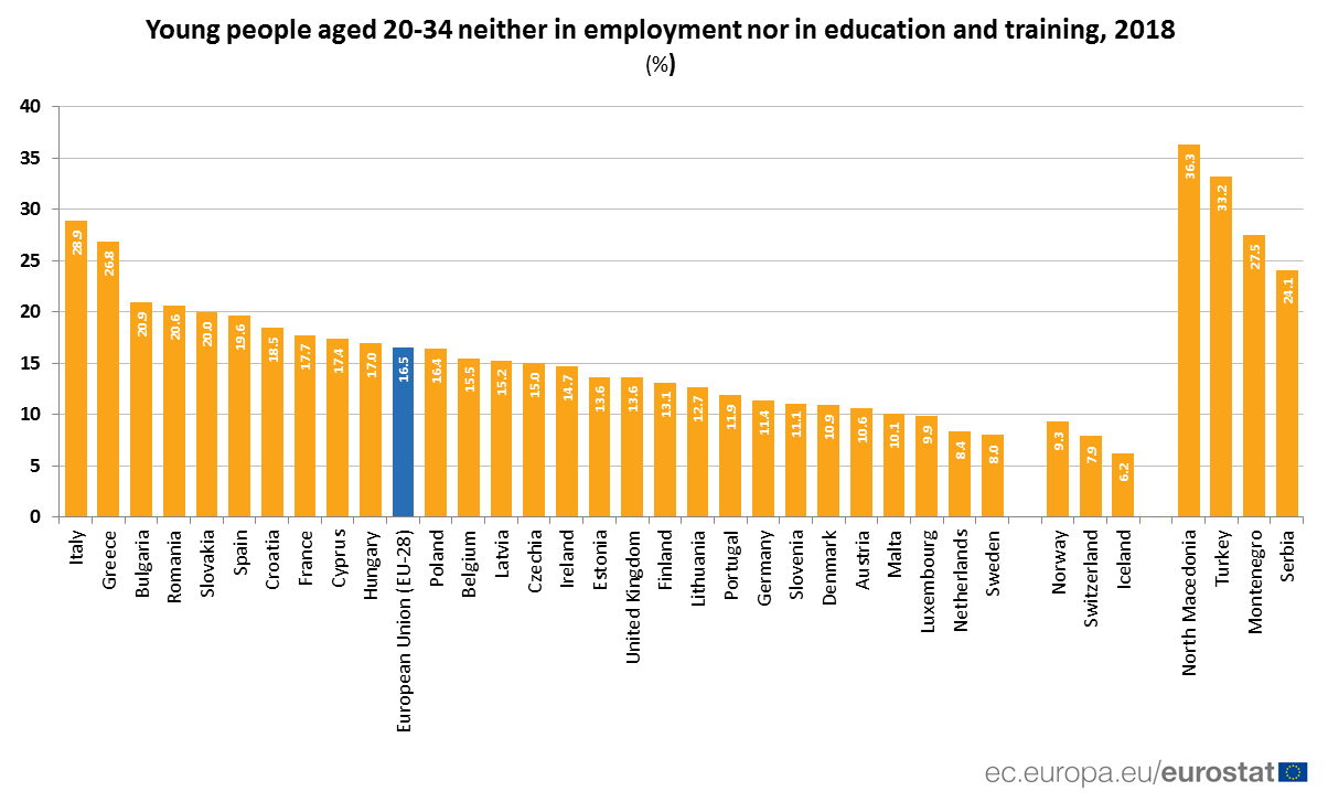 S druge strane, Italija i Grčka su, u poređenju sa drugim članicama Evropske unije, države sa najvišim procentom nezaposlenih i neškolovanih mladih ljudi – 28,9 i 26,8 odsto, što znači da više od četvrtine mladih u ove dve države spada u ovu grupu.