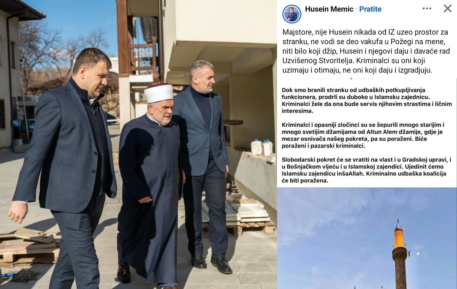 “Majstore, nije Husein nikada od IZ uzeo prostor za stranku, ne vodi se deo vakufa u Požegi na mene, niti bilo koji džip, Husein i njegovi daju i davaće rad Uzvišenog Stvoritelja. Kriminalci su oni koji uzimaju i otimaju, ne oni koji daju i izgradjuju.”
