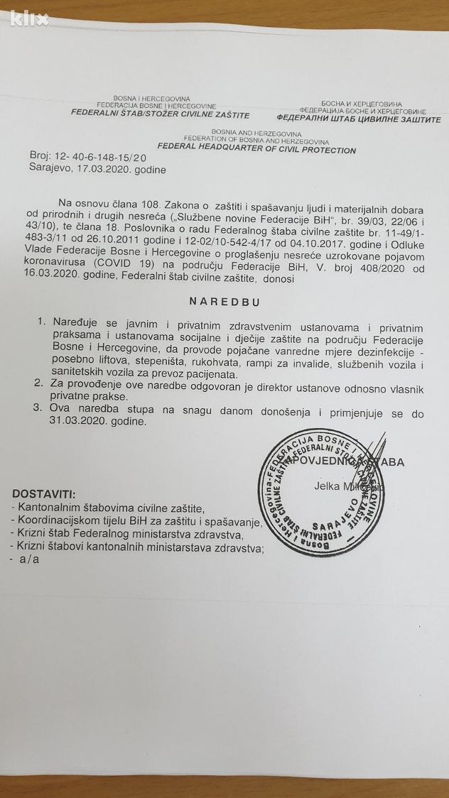 U fotogaleriji možete pročitati sve naredbe koje su izdate na području cijelog entiteta Federacija BiH koje stupaju na snagu 18. marta (srijeda) u 06:00 sati.