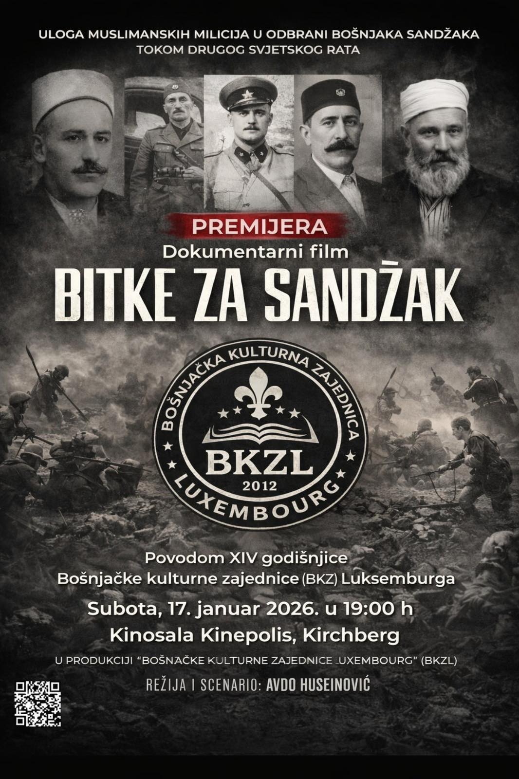 Bošnjačka kulturna zajednica (BKZ) Luksemburga s ponosom najavljuje premijeru dugometražnog dokumentarnog filma „Bitke za Sandžak“, autora Avda Huseinovića, koji kroz priču o hrabrosti i otporu Bošnjaka Sandžaka u Drugom svjetskom ratu prikazuje ključne bitke i herojska djela komandanta i boraca.