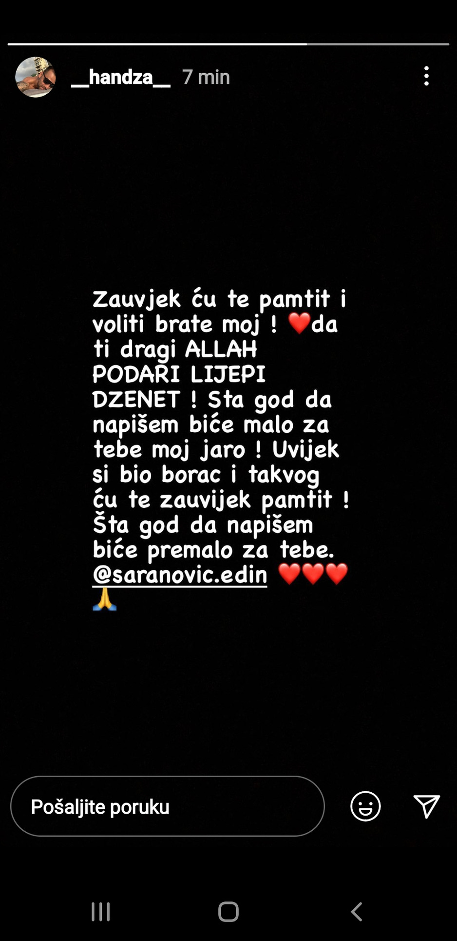 “Zauvijek ću te pamtiti i voljeti, brate moj. Da ti dragi Allah podari lijepi džennet. Šta god da napišem, bit će malo za tebe, moj jaro. Uvijek si bio borac i takvog ću te pamtiti zauvijek”, poručio je Handžić.