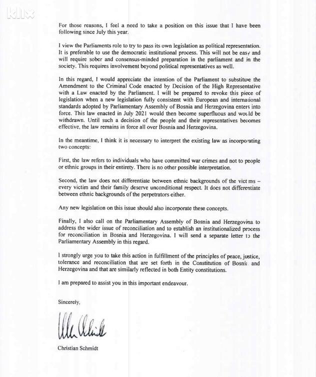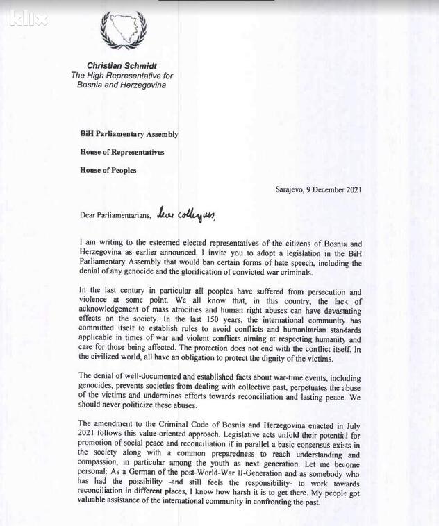 “Pozivam vas da u Parlamentarnoj skupštini BiH usvojite zakon kojim bi se zabranili određeni oblici govora mržnje, uključujući i negiranje svakog genocida i veličanje osuđenih ratnih zločinaca”, piše Schmidt na početku.