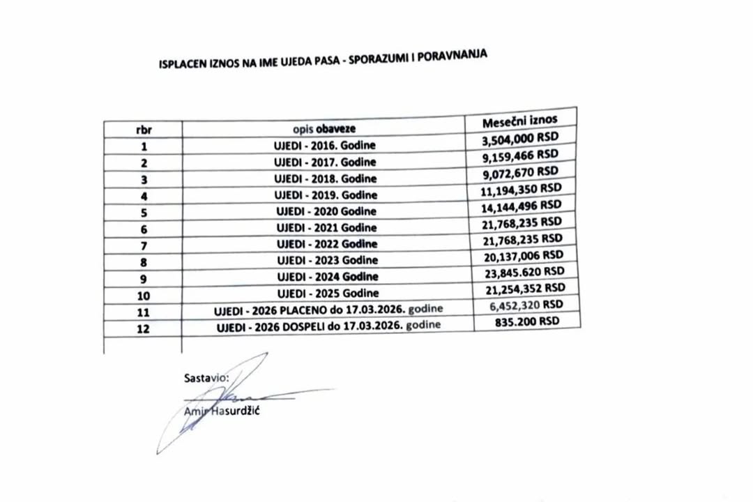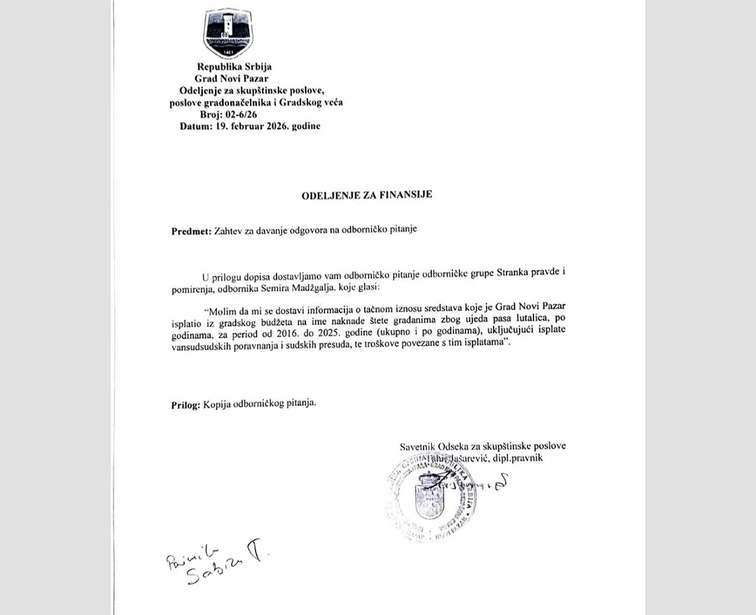 Na osnovu zvaničnog odgovora na odborničko pitanje odbornika SPP-a Semira Madžgalja, utvrđeno je da je Grad Novi Pazar u periodu od 2016. do 2025. godine isplatio ukupno 155.848.430 dinara iz budžeta na ime naknade štete zbog ujeda pasa lutalica.