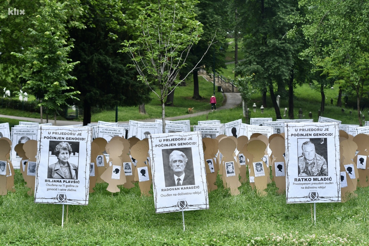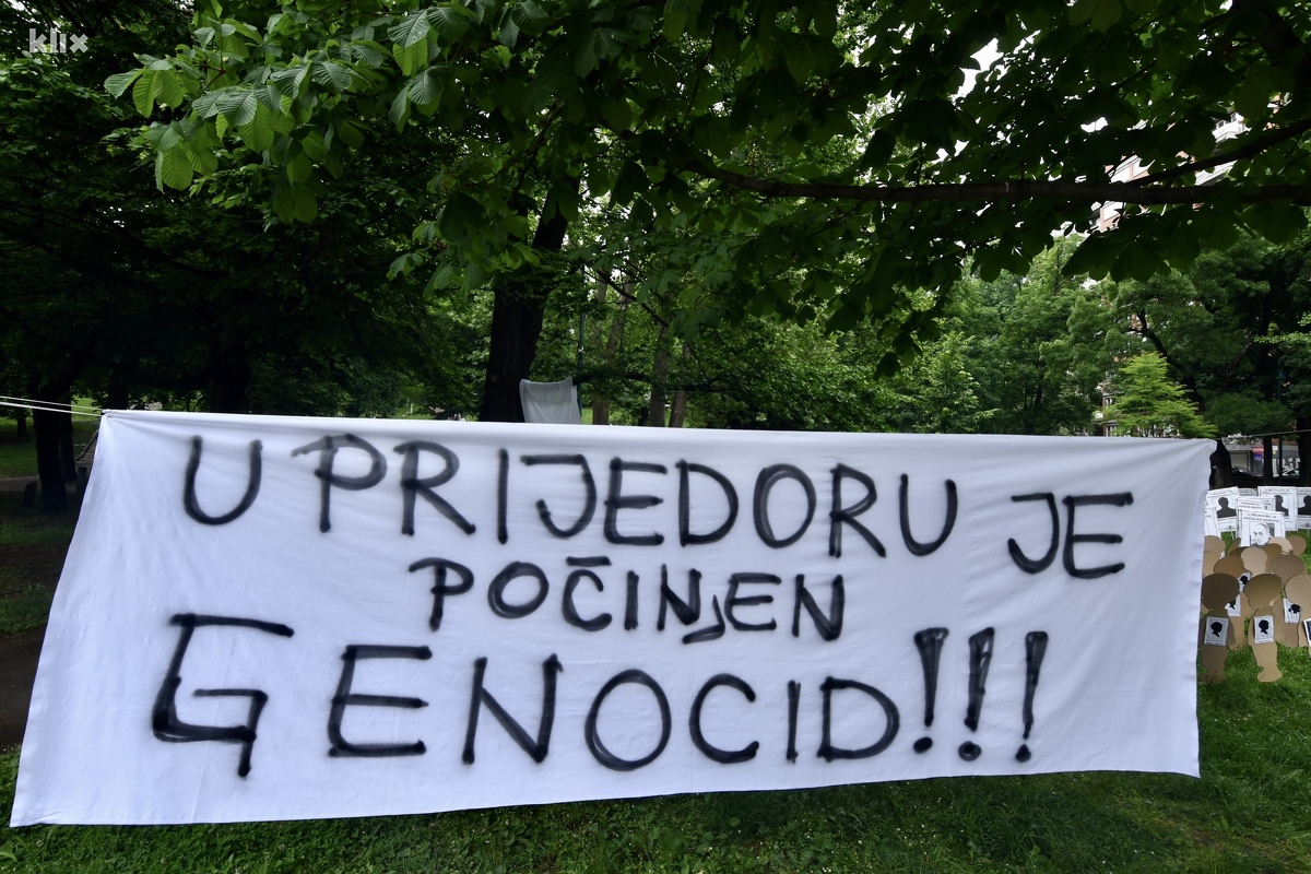 ispred instalacije je postavljena parola “U Prijedoru je počinjen genocid”.
