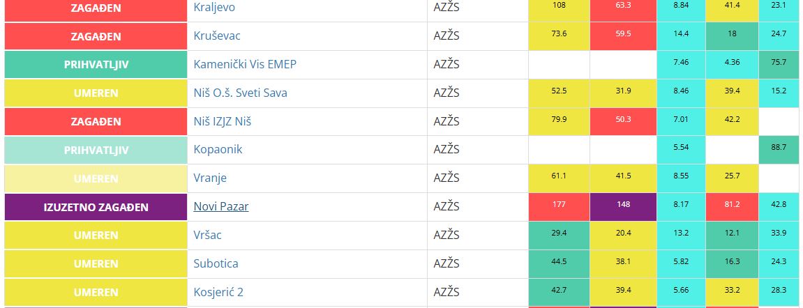 Sinoć od 20 do 21 čas vazduh u Novom Pazaru, ali i u Užicu, Lazarevcu i na dve merne stanice u Nišu, bio je najzagađeniji, što se kategorizuje kao izuzetno zagađen.
