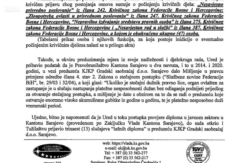 Kažu kako u skladu s potpisanim Sporazumom o saradnji između Kantonalnog tužilaštva Kantona Sarajevo i Ureda za borbu protiv korupcije i upravljanje kvalitetom Kantona Sarajevo, a s ciljem izrade i podnošenja krivične prijave, o svemu navedenom je upoznat Šef Odjela za privredni kriminalitet i korupciju predmetnog Tužilaštva, prilikom čega je Ured od Tužilaštva dobio određene upute i sugestije, na osnovu kojih ured trenutno radi na prikupljanju određenih dodatnih podataka i dokumentacije, a sve radi poboljšanja kvaliteta i formata krivične prijave.