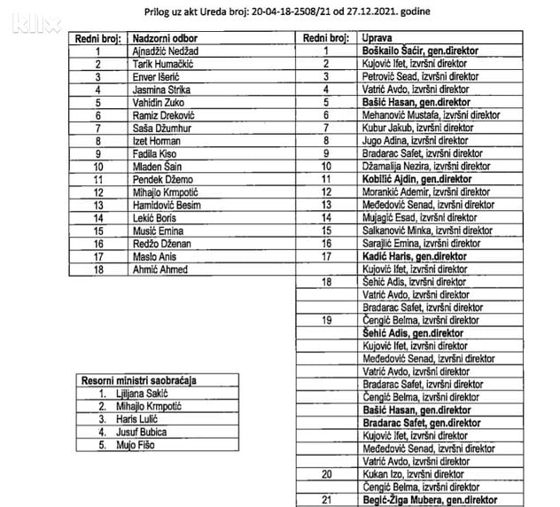 Među 47 imena nalazi se i pet bivših resornih ministara (Ljiljana Sakić, Mihajlo Krmpotić, Haris Lulić, Jusuf Bubica i Mujo Fišo), 18 članova nadzornih odbora te 24 izvršna ili generalna direktora, navodi se u informaciji dostavljenoj 21. decembra 2021.