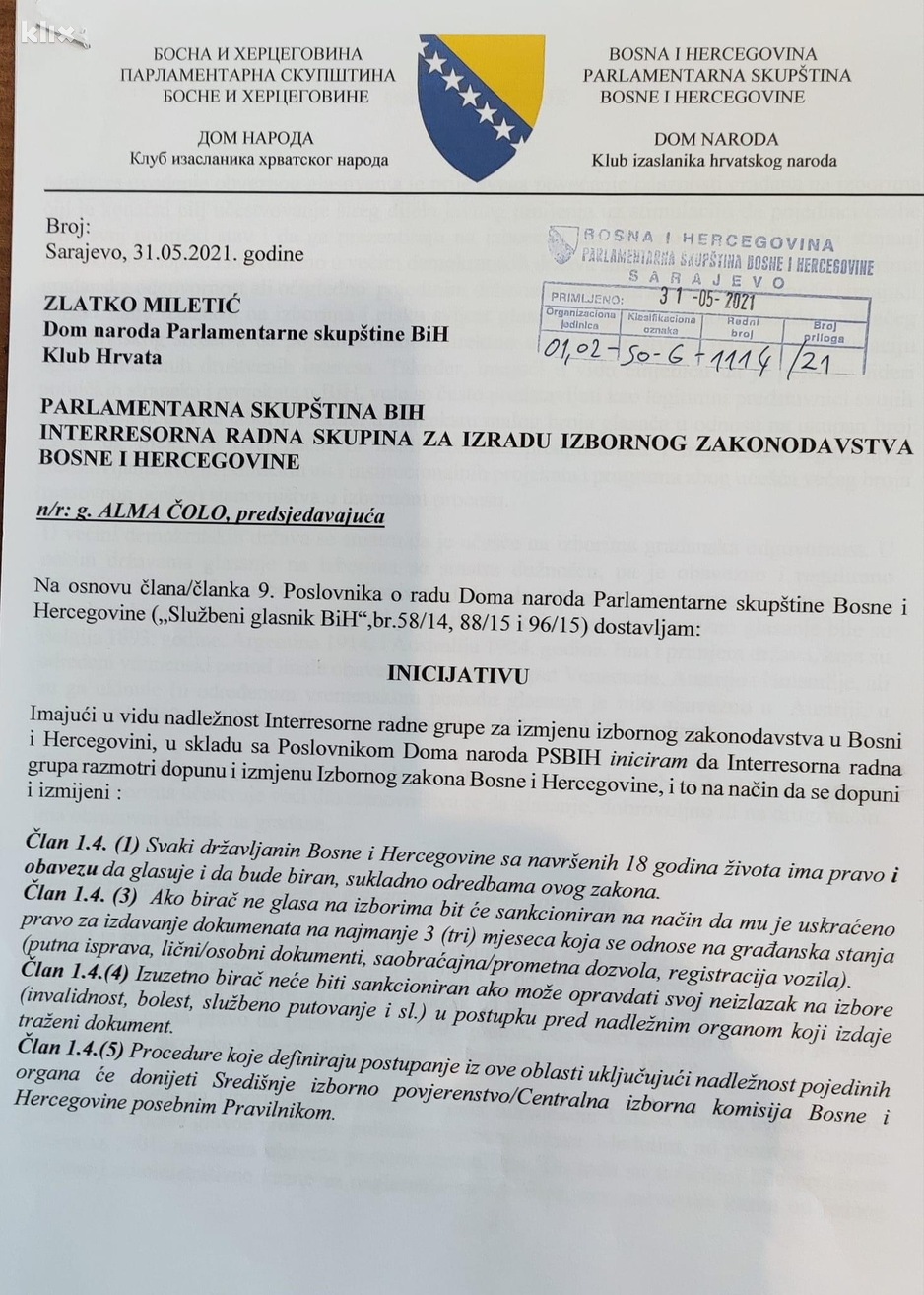 Delegat iz Kluba Hrvata u Domu naroda Parlamentarne skupštine Bosne i Hercegovine Zlatko Miletić podnio je danas inicijativu za uvođenje obaveznog glasanja na izborima u BiH.