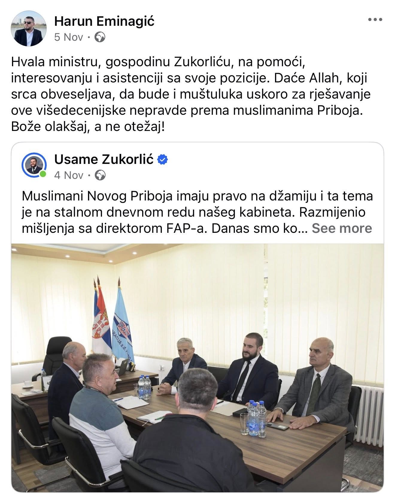„Hvala ministru, gospodinu Zukorliću, na pomoći, interesovanju i asistenciji sa svoje pozicije. Daće Allah, koji srca obveseljava, da bude i muštuluka uskoro za rješavanje ove višedecenijske nepravde prema muslimanima Priboja. Bože olakšaj, a ne otežaj!“